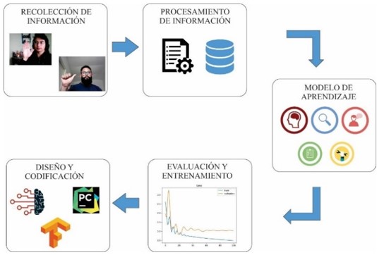 Asegurando la construcción del modelo deductivo, se estableció una metodología que proporcionó un acercamiento detallado dentro de 5 etapas (Figura 1), cada una de las cuales cumplió una característica primordial para el desarrollo del modelo deductivo: Recolección de información, procesamiento de información, estudio de modelo de aprendizaje, evaluación y entrenamiento, y, diseño y codificación.