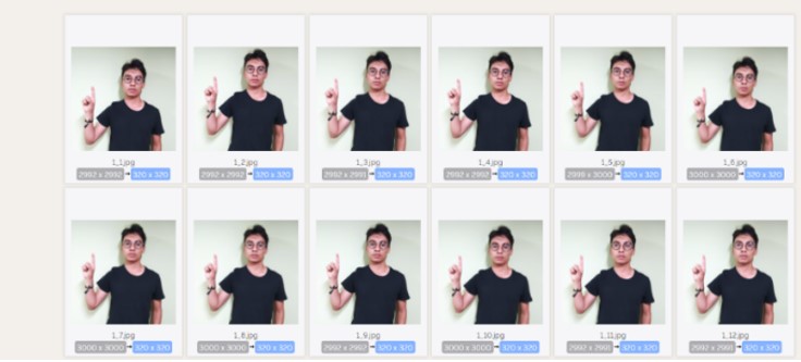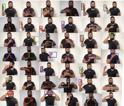 Se realizó la toma y estudio de las imágenes correspondientes a cada patrón y gesto del lenguaje de señas colombiano, para así formar un sistema homogéneo de información el cual formó un conjunto de datos, en este conjunto de datos se encuentran estipuladas 64 palabras básicas de comunicación, letras del alfabeto y números del 1 al 10 (Figura 2). Cada una de estas imágenes adquiridas están dentro del ambiente de estudio educativo básico que conformaron el conjunto de entrenamiento y evaluación del modelo deductivo implementado.
