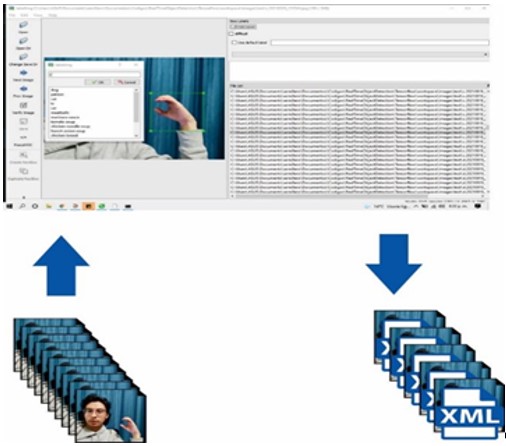 Seguido de la recolección de la información se realiza un estudio y procesamiento detallado de la información e imágenes generadas dentro del conjunto de datos ya establecido, validando y clasificando cada una de las imágenes adquiridas. La Figura 3 muestra como las imágenes capturadas pasan a un procesamiento y análisis para la eficacia del modelo de entrenamiento, extractando automáticamente de cada una los datos como: La ubicación, orientación, lugar de articulación y punto de contacto de las manos, por medio de una herramienta de clasificación de imágenes llamada LabelImg 9,10.