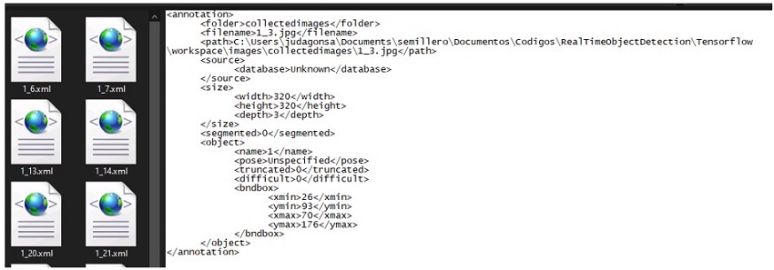 Es importante señalar que a la hora de tener y/o construir el conjunto de datos, es bueno contar con un buen número imágenes desde varios tipos de ángulos, posiciones y que no sean de gran tamaño o variante dentro de cada una de las imágenes 12,13. Por motivos de peso en los archivos puede tardar el procesamiento de imágenes a la hora de ejecutar el entrenamiento del modelo. Obteniendo de cada una de las imágenes como resultado un archivo en formato XML, en este archivo se encuentra, posición, tamaño, ruta de la etiqueta y nombre exacto de la sección a la cual el modelo debe basarse para el conjunto de entrenamiento y prueba (Figura 5). Cada parte de estas características están descritas dentro de etiquetas XML. De esta forma el modelo toma a la hora del procesamiento cada uno de estos archivos y los valida con cada clase suministrada.