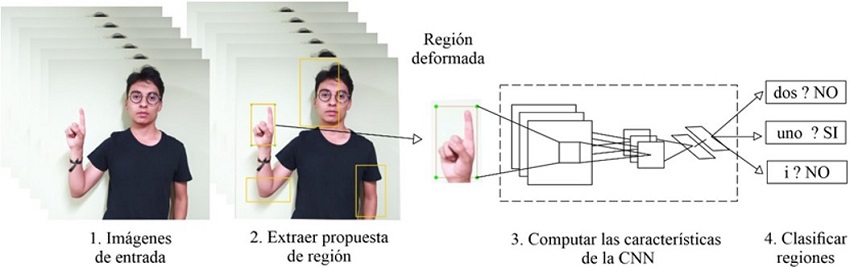 Dando como salida una región rectangular enmarcada dentro de una imagen establecida y conocida como Región-CNN (R-CNN) 21, la cual es una técnica que consta de varias etapas establecidas para realizar la detección de objetos.
