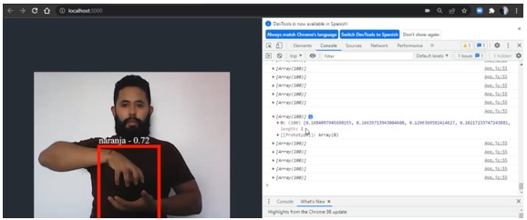 La ruta nombrada anteriormente, asegura que el acceso y uso al modelo queda ajeno a cualquier plataforma tecnológica, con lo que es pertinente recalcar que puede hacer uso del modelo tanto plataformas web como móviles o tal así dentro de la compilación de TensorFlow. Para la prueba de acceso al modelo se desarrolló una plataforma web mediante el uso del Framework de Facebook conocido como React JS al cual accede a la cámara del dispositivo y hace el llamado del modelo en tiempo real para lograr la detección el cual se detalla en la Figura 9, código expuesto en el siguiente enlace https://github.com/Sarl23/ReactComputerVision.