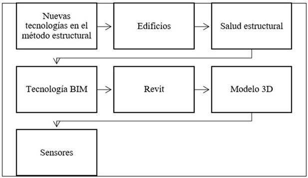 El modelado BIM es un aplicativo que permite mejorar y aumentar el uso de normas y estándares ya establecidos, mejora la calidad de proyectos avanzados y la consistencia. Es viable ya que reduce el tiempo de verificación lo cual genera ahorros. BIM es un sistema informático que permite el intercambio de información entre otros softwares, esto permitirá el desarrollo para muchas empresas 52. La razón principal es la necesidad de combinar BIM con diferentes tecnologías, lo que resulta en una falta de inter funcionamiento con varios estándares en competencia para la gestión de datos, y la falta de equipos de proyectos experimentados. Por tanto, es necesario que se practique con la labor del proceso de estandarización para mejorar el uso de la tecnología BIM y sus beneficios con la perspectiva de la seguridad del edificio 53. BIM es una herramienta muy útil que se plantea mediante dibujos para realizar una gestión de los edificios digitalmente, pero a la vez es tedioso cuando se trata de imágenes al plasmarlo en la herramienta, para obtener las características de la imagen o dibujos de diferentes diseños se toma como apoyo la tecnología de fase de imágenes ya que permite recopilar información de los dibujos de elementos estructurales y es un método confiable 54. BIM es una herramienta manejable y valiosa porque facilita en la toma decisiones en la ingeniería civil, permite gestionar los datos del edificio, evaluar los diseños con exactitud en el proceso 55. En la industria de la construcción BIM ha alcanzado cosas positivas en su uso y seguirá revolucionando años tras años, es una herramienta multidisciplinaria que se incorpora en un solo modelado, algunas empresas están optando esta tecnología ya pe permite reducir errores en los proyectos a diferencia de lo que se usaba tradicionalmente como el AutoCAD o el papel 56. Durante décadas, los investigadores utilizan equipos de captura de la realidad, visión por computadora y algoritmos de modelado 3D para automatizar parte de la creación BIM y la reconstrucción, utilizando tecnología como escáneres láser para edificios existentes, cámara de digitalización y alcance 57. El diseño de edificios se solicita condiciones tanto térmicas como la calidad del aire mediante un análisis detallado, una de las dificultades es la disconformidad de datos, mediante el modelo 3D y como base el uso de BIM para que se evalué el beneficio energético y el confort del edificio para resolver la interoperabilidad en los cambios de datos 58. La importancia y utilidades del método BIM es la capacidad de integrar objetos paramétricos en el modelo 3D, lo que les permite relacionar e instruirse con el resto de componentes, y suministrar un modelo paramétrico que acceda únicamente las funciones que se deben adaptar 59. Los proyectos de construcción globales en el ámbito de la gestión de la obra, se incluyen el modelo 3D, ya que requieren una planificación de la seguridad y la prevención de riesgos laborales 60. BIM tiene la capacidad de interpretar más exigente en el control de documentos y concede una relación similar a la observación de proyectos en desarrollo de construcción, la dificultad de no finalizar la vigilancia se resuelve en tipos y cantidades de sensores con simulación 3D en proyectos de edificios 61. El monitoreo y la gestión estructural visualiza en 3D, basados en los requisitos del sistema, los módulos funcionales, el marco de integración del sistema, propusieron un sistema de monitoreo de la salud estructural, basado en el desarrollo secundario de Revit, la construcción de la estructura de monitoreo se aplica a través del establecimiento de un mecanismo de fusión de datos de BIM, que puede mejorar el flujo de información de monitoreo durante el proceso de construcción 62. El estudio de un modelado que se aplica en BIM se determina los costos de los residuos de construcción en edificaciones, detallando el tipo de material y las etapas de trabajo. El aporte importante es el uso de la plataforma Autodesk Revit para cuantificar la acumulación de datos de modelos digitales basadas en la información de proyectos de edificios para producir más estimaciones de los residuos con la finalidad evaluar la salud estructural 63. BIM arquitectónico y SHM se modelan en Autodesk Revit Structure y luego se exportan a ETABS para el análisis estructural, se determina también la ubicación ideal para instalar sensores SHM, el sensor de deformación se modela y se coloca en la posición designada en el modelo BIM y la herramienta de visualización externa, verifica que el sensor modelado y sus datos relacionados se monitorean de manera efectiva en tiempo real en el sistema para lograr un entorno inteligente 64, En la Figura 1 se presenta el diagrama de flujo donde se muestra tecnologías en el método estructural en edificación.