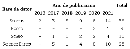 Las revisiones de fuentes bibliográficas cuentan con el apoyo de autores, investigadores y estudiosos de la disciplina, con resultados publicados en revistas científicas, tesis de pregrado y posgrado, entre otros; y actualizaciones y publicaciones en la web. La consulta de diferentes bibliografías permite al investigador tener una visión y un panorama amplio, es decir, puede abarcar y construir juicios, así como nuevas investigaciones sobre el tema estudiado. Se realizaron revisiones literarias a través de la web utilizando textos y palabras clave tanto en inglés como en español, por lo que se decidió buscar referencias en inglés, ya que existía una bibliografía más confiable y diversa en ese idioma.