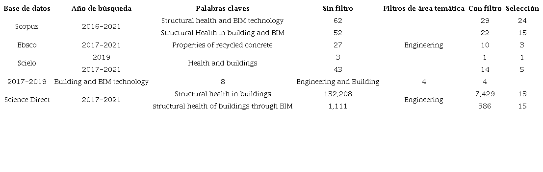 En la presente revisión literaria se aplicaron 80 artículos indexados en las bases de datos Scopus, Ebsco, Scielo y Science Direct, los cuales están entre los años 2016 - 2021, estos fueron registrados en una bitácora de búsqueda, creando una hoja de cálculo los cuales se organizaron en un cuadro de detalle, como se denomina en la Tabla 1, así en la base de datos “Scopus” se encontraron 114 artículos, después de aplicar los filtros se identificaron 51, de los cuales se seleccionaron 39. En la base de datos “Ebsco” se encontraron 27 artículos, después de aplicar los filtros se identificaron 10, de los cuales se seleccionaron 3. Asimismo, en la base de datos “Scielo” se encontraron 54 artículos, después de aplicar los filtros se identificaron 18, de los cuales se seleccionaron 10. Finalmente, de la base de datos “Science Direct” se encontraron 133,319 artículos, después de aplicar los filtros se identificaron 7,815, de los cuales se seleccionaron 28. Para la búsqueda de información se utilizaron las siguientes palabras clave: Structural health and BIM technology, Structural Health in building and BIM, Properties of recycled concrete, Health and buildings, Building and BIM technology, Structural health in buildings, structural health of buildings through BIM. Se usaron filtros de áreas temáticas tales como: Engineering, Engineering and Building para obtener información más detallada observar la Tabla 2.