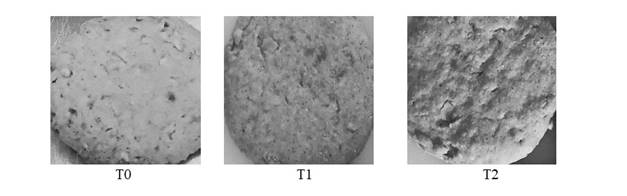 En la Tabla 4, se describen los resultados obtenidos para cada tratamiento, existen pocas diferencias significativas entre tratamientos. Se observa una diferencia significativa de los parámetros L* (luminosidad) y a*(de verde a rojo) en los tratamientos T1 y T2, sin embargo, no existe diferencia significativa en los valores del parámetro b* (de azul a amarillo). El color de la galleta es dorado, ya que las coordenadas positivas para b* indican color amarillo y positivas para a* indican un color rojo, con una luminosidad (L*) media, que indica que no está pálida, ni quemada. En el color también se observan puntos blancos en las galletas T1 y T2 (Figura 1), debido a partículas de la HQ que no absorben los ingredientes húmedos.