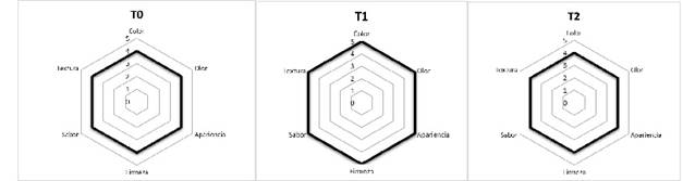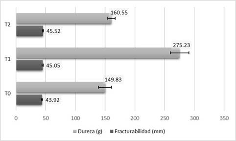 En la Figura 2 se pueden apreciar los resultados de fracturabilidad y dureza para cada tratamiento. En fracturabilidad se observan resultados similares para T0, T1 y T2, este parámetro textural representa la distancia recorrida por la sonda antes de la rotura, o deformación de la galleta 43.