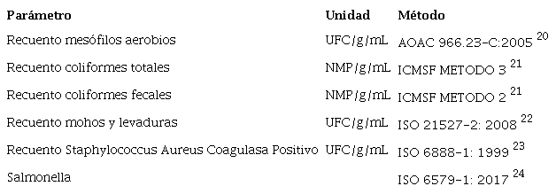 Se realizó la caracterización microbiológica de las galletas: Los análisis y los métodos, se presentan en la Tabla 1.