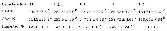 En la Tabla 2 se describen los resultados obtenidos, se presentan diferencias significativas ya que la HQ tiene un mayor porcentaje de humedad que se ve afectado por las actividades de secado realizadas de forma artesanal. No obstante, los resultados cumplen con la normatividad, la humedad máxima permitida es 13.5% según la NTC 6069 12.