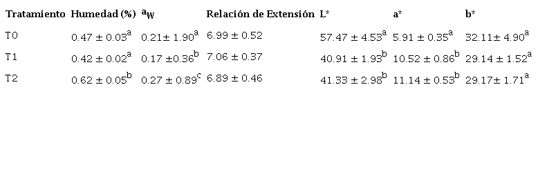 La aW confirma que el producto se clasifica como un producto seco y a su vez indica que poseen óptimas condiciones para su comercialización al obtener bajos valores, disminuye el riesgo de crecimiento de mohos y levaduras 38. En la Tabla 3 se evidencian diferencias significativas entre los tratamientos.