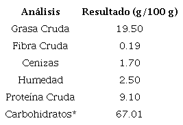 Se utilizaron los métodos oficiales AOAC 20: humedad AOAC 925.09, proteína AOAC 14.026, Grasa AOAC 10.102, Cenizas AOAC 10.144, Fibra 10.145 y carbohidratos por cálculo, los análisis se realizaron por triplicado para cada tratamiento.
