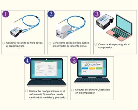 Conexiones de los elementos de medida para la técnica Espectroscopia óptica de Fluorescencia: La fibra óptica se compone de dos extremos, y uno de ellos se divide en dos partes. El primero se conectará con el espectrómetro y el segundo se conectará a la fuente de luz LED mediante un lente colimador. El otro extremo de la fibra óptica es un conducto flexible que iluminará las biopsias de tejido de cuello uterino. Posteriormente, se realiza la conexión del espectrómetro con el computador a través de un cable USB. En el computador se realiza la respectiva configuración en el software OceanView para la toma de los espectros del tejido. (Figura 1)