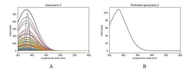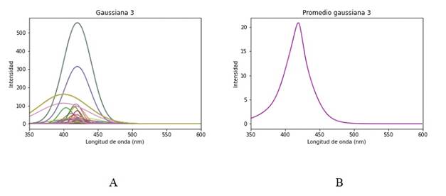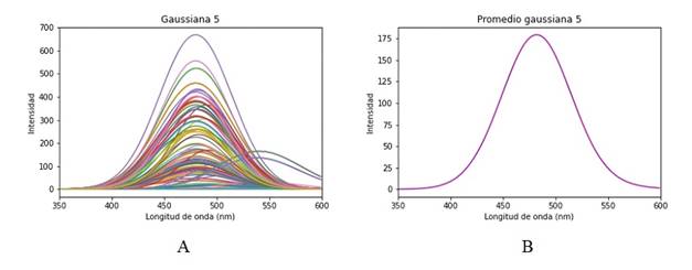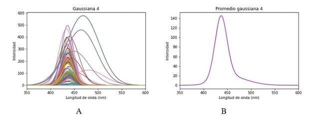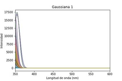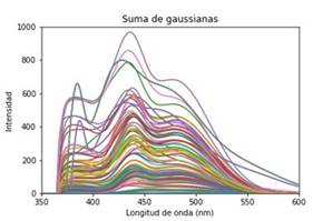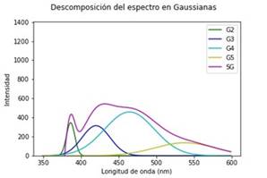 Posteriormente, siguiendo la metodología se hace un procesamiento de la señal a fin de seguir estudiando el comportamiento del espectro, se realizó el ajuste que permite calcular la contribución de cada fluoróforo y descomponer el espectro en gaussianas simulando los valores obtenidos del ajuste con la Ec. 2.