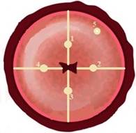 Posición para medición de biopsias de cuellos uterinos: Se realizan mediciones en cada uno de los cuellos uterinos en 5 puntos de análisis, como se muestra en la Figura 3. Cuatro puntos se toman después de la unión escamosa cilíndrica posterior al orificio cervical externo, donde hay mayor presencia de células escamosas y se presentan la mayoría de cánceres. Se siguen las manecillas del reloj y se procura mantener el mismo radio de medida. Cabe aclarar que no se toman medidas en las zonas con cortes y el quinto punto es aleatorio o donde el tejido presente anomalías visibles.