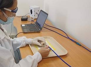 Adquisición de señales espectrales de fluorescencia: Se activa la fuente de luz LED y se realiza una leve presión con uno de los extremos de la sonda de fibra óptica sobre la zona del tejido a medir. Desde el computador, se activa el proceso de guardado de la información espectral de fluorescencia. La configuración del software para almacenar la información consta de realizar 30 registros espectrales por cada punto de análisis sobre el tejido cervical, los cuales se promedian para obtener un solo espectro por punto medido y luego realizar el procesamiento. (Figura 4)