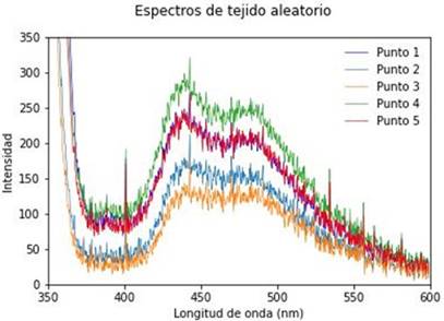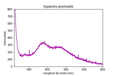 Se utilizó la técnica de espectroscopia óptica de fluorescencia con una longitud de onda en el rango de 335 a 345 nm como fuente de luz electromagnética para excitar la muestra. Se aplicó a 22 tejidos de cuello uterino proporcionados por el ICP, se tomaron medidas en 5 puntos de cada una de las biopsias de cuellos uterinos, lo que resultó en un total de 110 puntos analizados. La Figura 5 muestra el espectro de emisión seleccionado al azar de una de las biopsias en estudio y en la Figura 6 muestra el espectro promedio de los 110 puntos de análisis. Preliminarmente, se observa una respuesta activa en el rango de 380 a 560 nm.
