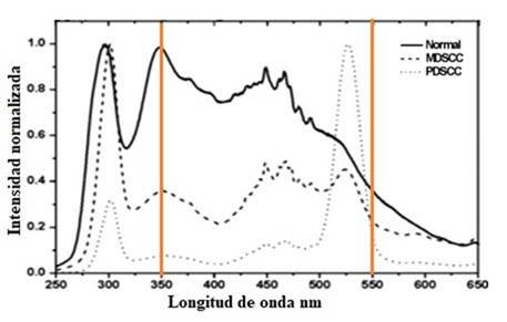Sin embargo, en la Figura 7 se evidencia un cuarto pico que pertenece a los 500 a 550 nm en los espectros con algún tipo de carcinoma. En dichas longitudes de onda el espectro obtenido con radicación LED sigue activo y es posible que dependa del estado en el que se encuentra la biopsia o esté circunscrita en la tercera banda. Se hace énfasis en que, el espectro obtenido guarda un alto grado de similitud con los de la literatura y reaccionan según lo esperado, además, dependiendo del punto de análisis cambia la intensidad de la respuesta debido a las propiedades inherentes del tejido cervical que varían según la etapa de la displasia en la que se encuentre presente o no en el tejido. Lo anterior permite aseverar que la fuente de Luz LED funcionó de manera adecuada para excitar los tejidos.