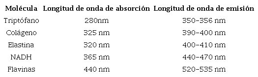 Para el funcionamiento óptimo de la técnica EOF, todos sus componentes deben funcionar de manera adecuada, iniciando con la fuente de luz que es la encargada de generar una excitación en el tejido estudiado. La emisión de la luz se puede producir en diferentes longitudes de onda, dependiendo del objetivo de cada estudio. En tejidos como el cuello uterino se usa la radiación en un rango de longitudes de onda entre 280 nm y 520 nm. En este tejido se encuentran presentes moléculas como el triptófano, FAD, colágeno, elastina, NADH, entre otras, que generan fluorescencia y contribuyen a la emisión del espectro cuando son excitadas. Por lo general la iluminación se realiza por medio de una fibra óptica que conduce la luz proveniente de la fuente hasta el tejido. A su vez, esta fibra va conectada al espectrómetro encargado de recolectar la información espectral proveniente del tejido para su posterior procesamiento 3.