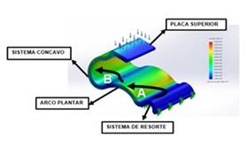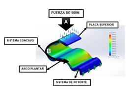 La prótesis estuvo sometida a una fuerza de 500N, al aplicar esta fuerza descendente (A) (Figura 3), en la placa superior, se logra distribuir y desplazar las cargas en todo el pie protésico (B) (Figura 3), haciendo énfasis en dos puntos sistema cóncavo y arco plantar que equivale a los apoyos antero interno y externo; esto describe el esfuerzo normal que llega a soportar el material sin sufrir deformaciones.