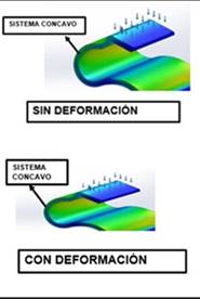 Se evidencia la absorción del impacto (B) (Figura 3), al que fue sometido el tendón de Aquiles, emulada por el sistema cóncavo, al ser sometido a una fuerza de 500N es capaz de deformarse sin sufrir daños la prótesis, (Figura 4) con el paso de la energía en 1.8 N/m2 de 6 N/m2 máximo según el modelo de Young, módulo de elasticidad longitudinal es un parámetro que caracteriza el comportamiento de un material elástico, según la dirección en la que se aplica una fuerza 19.