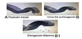 Una vez distribuidas las cargas en el arco plantar, esta energía llega a la estructura denominada Sistema De Resorte, la cual con su estructura de semiflexión simula la articulación de los dedos del pie, gracias a este comportamiento elástico, el sistema de resorte se elonga (B), (Fig., 2.3) para poder desplazar la energía y permitir que se cumpla el ciclo de la marcha; aplicando el modelo de Young. Este modelo de Young, describe el principio de elasticidad física del material 20.