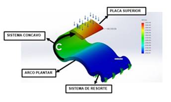 Debido al comportamiento elástico, el sistema de resorte se elonga (B) (Figura 5) para poder desplazar la energía, llegando a una etapa de máxima elongación (B1). (Figura 5), permitiendo el ciclo de la marcha. La energía es desplazada por el sistema de resorte, esta es transferida al arco plantar (A) (Figura 6) posteriormente se dirige al sistema cóncavo (B). (Figura 6). La energía sigue subiendo hasta llegar a la placa superior (C) (Figura 7), en este segundo momento el arco plantar y el sistema de resorte dejó de estar sometido a tensión, como se puede observar en la coloración de la imagen, esto permite generar el arranque para el siguiente paso de la marcha.