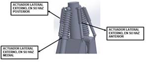 El pie protésico cuenta con un sistema de actuación compuesto básicamente por los elementos encargados de producir la potencia mecánica del sistema, estos elementos son comúnmente llamados Actuadores, dispositivos capaces de generar una fuerza a partir de líquido, energía eléctrica o gaseosa. De acuerdo con esta definición podemos distinguir tres tipos de actuadores: hidráulicos, neumáticos y eléctricos. 21) Los actuadores se encuentran ubicados en 3 posiciones: anterior, medial y posterior, a cada lado del tobillo. (Figura 8) Recreando las veces de los ligamentos como estabilizadores pasivos, tendones y músculos estabilizadores activos.
