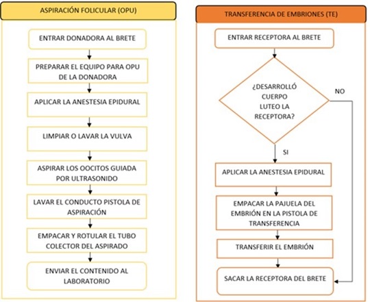 Desde un tipo de investigación cualitativa, con un enfoque descriptivo, exploratorio y correlacional, se realizó un estudio de tiempos de las actividades correspondientes al proceso de transferencia de embriones, en el que se desglosaron las actividades específicas para llevar a cabo el proceso en campo de aspiración folicular de oocitos OPU y transferencia de embriones TE. Se midieron los tiempos de cada actividad con la ayuda de un cronómetro y el formato de registro de tiempos, para establecer el ritmo de ejecución de las actividades, el “tiempo tipo”, el “tiempo estándar” y los “suplementos” propios de cada operación; estos se monetizaron relacionando los tiempos invertidos en cada actividad con el ingreso total de cada operario involucrado en el proceso y así mismo se obtuvieron los consumos de materiales e insumos para determinar costos de producción por embrión. Los datos fueron recolectados los días correspondientes a la OPU y de TE, los cuales se programaron con la empresa In Vitro Colombia® empresa que prestó el servicio, en los departamentos del Quindío, Risaralda y Valle del Cauca en marzo de 2019, donde se realizó la medición de tiempos en el proceso de OPU de 16 donadoras de la raza Gyr; igualmente se midieron los tiempos del proceso de TE en un grupo de 47 receptoras de la raza Gyrolando, sincronizadas para TETF. El flujograma (Figura 1) comprende las actividades del programa de TE para la medición de tiempos, donde se estableció el orden de ejecución y se agruparon en las etapas del proceso a cuantificar en campo: OPU y TE 10,11.