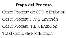 La TE combinada con la Aspiración Folicular de Oocitos (OPU) y aplicando la Fertilización In vitro (FIV) tiene un costo similar en la producción de embriones confirmados, a los reportados por Bolivar et al. 8, en los esquemas de SOV que evaluaron ($US 267.1 vs. $US 255.7), donde no se reporta aumento en los costos, a pesar de que se evita incurrir en gastos de protocolos hormonales para SOV de donadoras, de acuerdo a Aponte et al. 28.