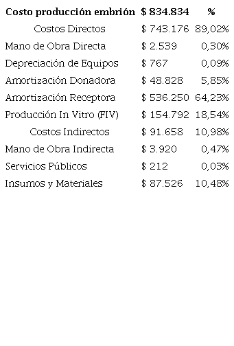 Se determinó que el costo de producción de un embrión transferido y confirmado a los 90 días de preñez es de $834,834 ($267.1 dólares), obtenido por la técnica de T.E acompañada de la Aspiración Folicular de Oocitos (OPU) y aplicando la Fertilización In vitro (FIV). El mayor rubro lo comprende la amortización de la receptora, abarcando el 64.23 % de los costos de producción.