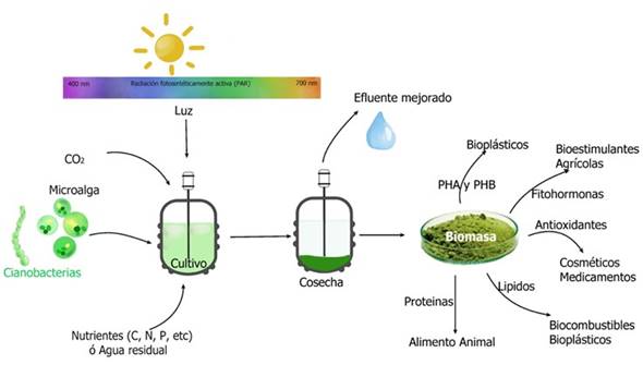 La producción de biomasa varía dependiendo de las especies de algas, técnicas o condiciones de cultivo (Temperatura, pH, intensidad de luz y concentración de nutrientes), al igual que el contenido de bioactivos 6, por tanto, la adecuación de un sistema que se ajuste de forma óptima a las condiciones requeridas es muy importante a la hora emplear las microalgas y cianobacterias 7. El ajuste de estas condiciones permite una mayor obtención de metabolitos de interés comercial, dentro de los que se encuentran los pigmentos en el sector farmacéutico y textil 8, los lípidos en el área de los biocombustibles 9; y los biomateriales como polihidroxialcanoatos (PHA) y polihidroxibutirato (PHB), usados como biopolímeros útiles 10,11.