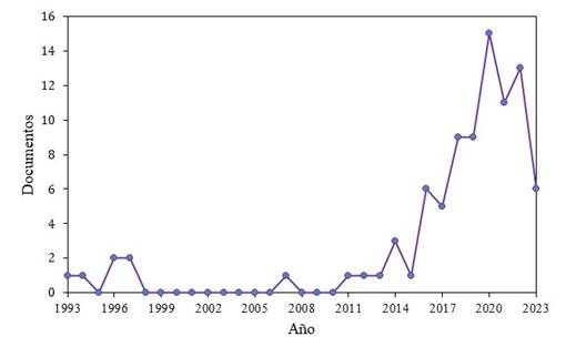Posteriormente, se realizó un análisis de los resultados obtenidos en SCOPUS, en donde se encontró un total de 88 artículos comprendidos entre los años 1993 -2023 (Figura 3), lo que comparado con los resultados obtenidos para aguas residuales abarca solo un 1.76 %. Se aprecia que las publicaciones antes del año 2011 se limitan a 7 y después de este año se presenta una tendencia creciente, encontrando su pico en el año 2020 con 15 artículos, sin embargo, es importante resaltar que el año 2023 se encuentra aún vigente.