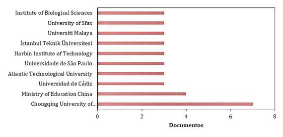 La Figura 4 muestra las instituciones vinculadas a procesos de investigación con microalgas y lixiviados, siendo en total 144 instituciones participantes. En este contexto se puede evidenciar que la institución principal es la Chongqing University of Technology encabezando la lista con 7 publicaciones, lo que se relaciona directamente con los resultados obtenidos para autores, puesto que los principales contribuyentes están vinculados a esta institución. Esta misma relación la guardan la Universidad de Cádiz y la Atlantic Technological University, siendo las afiliaciones más relevantes.
