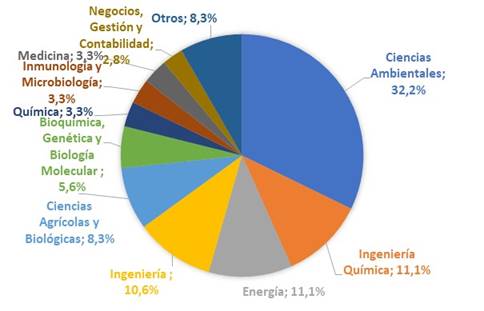 En total hay 18 áreas de estudio que han contribuido en investigaciones relacionadas con el cultivo de microalgas en lixiviados, tal como lo muestra la Figura 5, de las cuales las principales son: ciencias ambientales con 58 publicaciones, ingeniería química con 20, energía con 20, ingeniería con 19 y ciencias agrícolas y biológicas con 15 publicaciones. El hecho de que el área de ciencias ambientales abarque un 32.2 %, demuestra el enfoque que se le ha dado en los últimos años, pues aunque es un campo relativamente nuevo, las principales investigaciones abarcan aspectos del mejoramiento de la calidad del medio ambiente al implementar procesos de fitorremediación de un residuo altamente complejo aunque se encuentre a escala laboratorio o piloto 25.