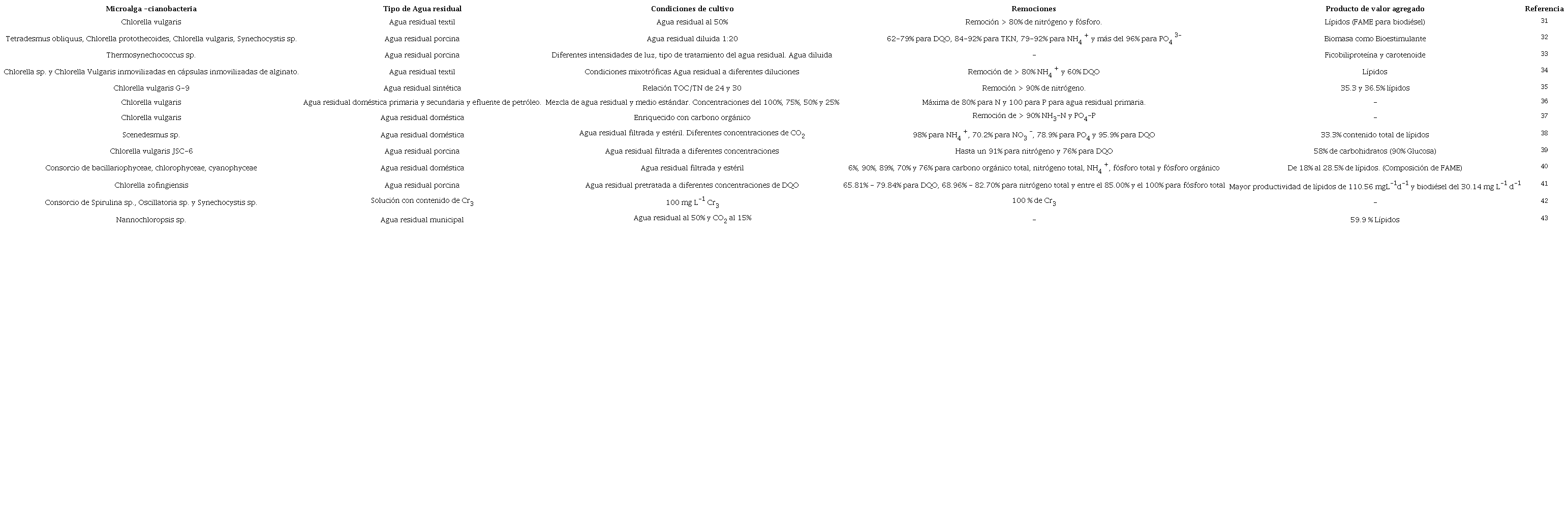 Las aguas residuales domésticas y porcícolas han sido las de mayor uso en cultivos de microalgas, pues su carga orgánica es fuente de nutrientes para su crecimiento 44. La microalga más ampliamente utilizada es Chlorella por su capacidad de adaptarse a diferentes condiciones. Los resultados de las diferentes investigaciones demuestran la habilidad de las microalgas para tratar aguas residuales, así como también de producir metabolitos de valor agregado, con el fin de crear técnicas sostenibles, lo que las hace una herramienta prometedora para el uso con otros tipos de aguas residuales.