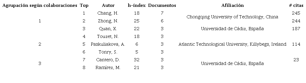 La Tabla 2 muestra los 8 autores más relevantes con base en el número de publicaciones y se reporta el número de citas. El análisis resalta que este top de autores se divide en 3 grupos, pues sus publicaciones son colaboraciones. Demostrando que a la fecha los estudios se limitan a unos grupos de investigación específicos y comprenden los años 2016 al 2023.
