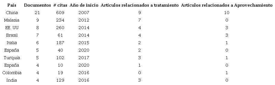 De igual manera la influencia de las contribuciones por países se presenta en la Tabla 3, en donde se detallan los 10 países con mayor producción bibliográfica, siendo china quien ocupa el primer lugar con 21 documentos. Así mismo se expone el número de artículos enfocados solamente a tratamiento de lixiviados de rellenos sanitarios con microalgas y el número de aquellos que buscan aprovechar los lixiviados para la generación de metabolitos, los demás documentos no contemplados hacen referencias a capítulos de libros, revisiones bibliográficas, procesos de aislamiento o análisis de toxicidad.
