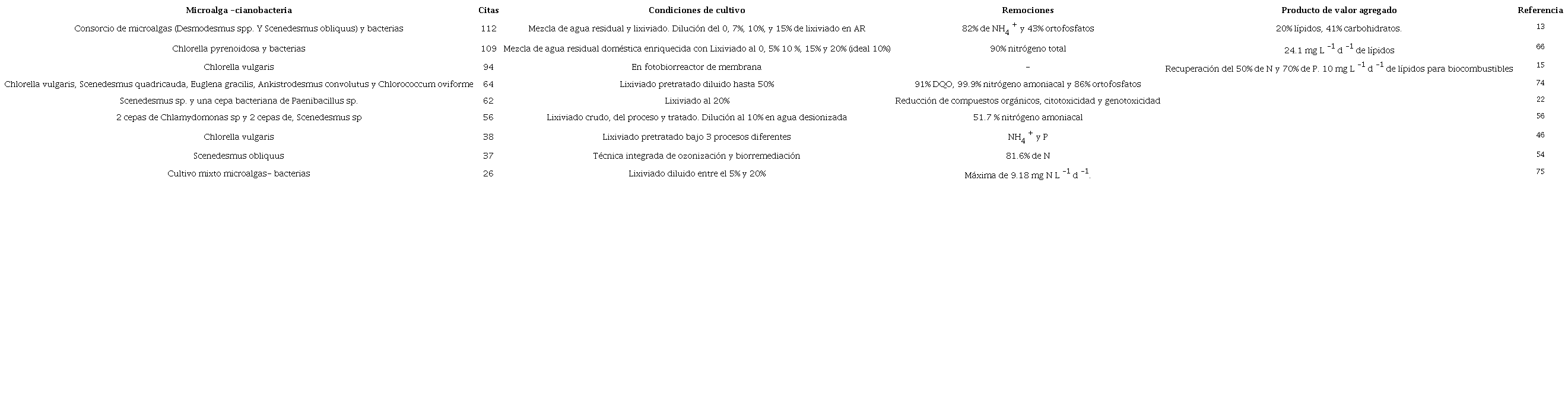 De los diferentes resultados se aprecia la implementación de cultivos mixtos con bacterias, lo que se atribuye a la habilidad de las microalgas para la eliminación de nutrientes y metales pesados, proporcionando O2, que es utilizado por las bacterias para degradar compuestos orgánicos 22. Otro factor importante es la relación N:P, para garantizar la estabilidad del proceso, pues las grandes cantidades de NH4+ pueden inhibir el crecimiento 46 al igual que las concentraciones por encima de los 80 mg N-NH3 L -1 (75 y la limitación de fósforo 55. Esto se evidencia en la necesidad de realizar pretratamientos al lixiviado o diluciones con el fin de disminuir el efecto inhibidor, en donde diversos estudios demuestran que la concentración más apropiada de dilución para el uso de lixiviados se encuentra en el 10 % 65 siendo Chlorella sp. la cepa más tolerante comparada con Scenedesmus sp. 76. Para cianobacterias los estudios son más limitados, reportando su uso junto con otros filos como Proteobacteria, Bacteroidetes y Chlorophyta como cátodos para la producción de energía y eliminación de nutrientes 77, entre otros.
