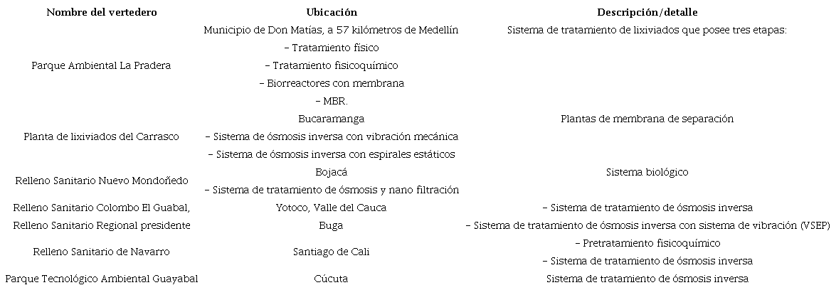 En Colombia la información referente a los lixiviados de rellenos sanitarios es limitada y su enfoque es la problemática ambiental que causan en los diferentes rellenos sanitarios, por lo cual los procesos relacionados con ellos se orientan hacia el tratamiento con el fin de mitigar los impactos ambientales. Diversas empresas han generado estrategias para su tratamiento, entre las que se destacan tratamientos físicos, fisicoquímicos y algunos procesos biológicos con consorcios de microorganismos, siendo el sistema de osmosis inversa el más implementado (Tabla 5) 78.