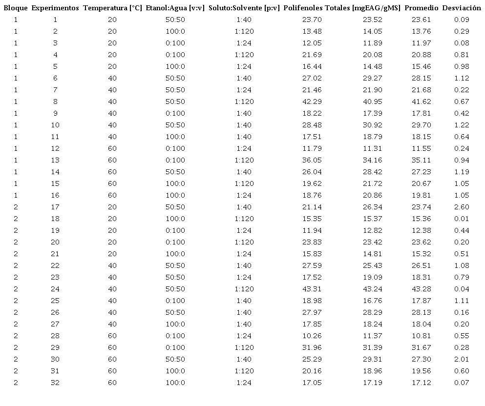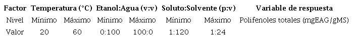 Para la determinación de las condiciones óptimas de extracción usando cáscara de cacao húmeda se planteó un diseño experimental de superficie de respuesta 23 con puntos centrados en las caras, por duplicado, y análisis ANOVA con significancia del 95 %, a través de TIBCO Statistica® 13.5.0 y Statgraphics Centurion XVI.I versión de prueba. Los niveles fueron los mismos trabajados por el Grupo de investigación en Ciencia y Tecnología de Alimentos de la Universidad Industrial de Santander - CICTA/UIS para cáscara de cacao secada, a excepción del pH, el cual se trabajó con el dado por la mezcla soluto- solvente (valores entre 6.1 y 6.5). En la Tabla 1 se muestran las variables, los niveles y la variable de respuesta evaluada en cada una de las corridas experimentales las cuales fueron en total 32.