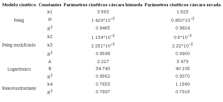 Se realizó el seguimiento de la cinética de extracción de polifenoles (usando cáscara húmeda) durante 4 h, tomando alícuotas de 1mL cada 10 min durante las primeras 2 h, y cada 30 min después de esta. Se hizo el ajuste de parámetros cinéticos evaluando modelos reportados en literatura 21 mostrados en la Tabla 2 utilizando el método Quasi-Newton del paquete TIBCO Statistica® 13.5.0.