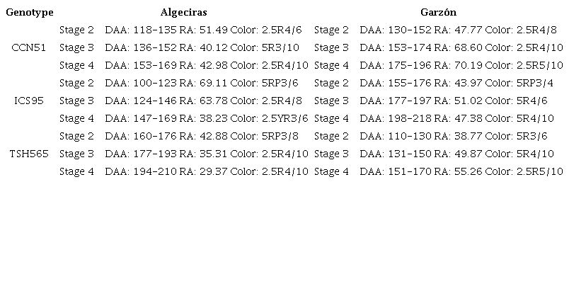 Cocoa fruits of the genotypes CCN51, ICS95, and TSH565 were selected for this study. These genotypes were in a productive development stage with 10 years of establishment. The fruits were picked following the collection framework permit granted to AGROSAVIA under Resolution No. 1466 of December 03, 2014, of ANLAS (Colombia), during the execution of the project "Technological strategies for harvesting and fermentation of cocoa beans to improve the Colombian cocoa sector" of the five-year-agenda of AGROSAVIA. Maturity stages were defined based on days after anthesis (DAA), respiratory activity (RA) in mL CO2 kg-1 h-1, and pod color (according to the Munsell color chart). Table 1 shows the parameters to establish the maturity stages of the genotypes studied.
