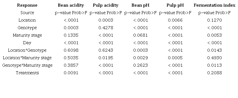 The ANOVA (Table 2) shows that the location and the day of fermentation have a significant effect (p < 0.001) on bean acidity and also on the maturity stage and day. Furthermore, the genotype*maturity stage and location*genotype*maturity stage interactions have a significant effect (p < 0.001) on pulp acidity.