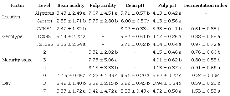 Tukey's multiple Pairwise comparison test results (Table 3) show statistically significant differences (p ≤ 0.05) in most of the variables except for pulp acidity in the genotype factor, bean acidity and bean pH in the maturity stage factor, and fermentation index in the treatments.