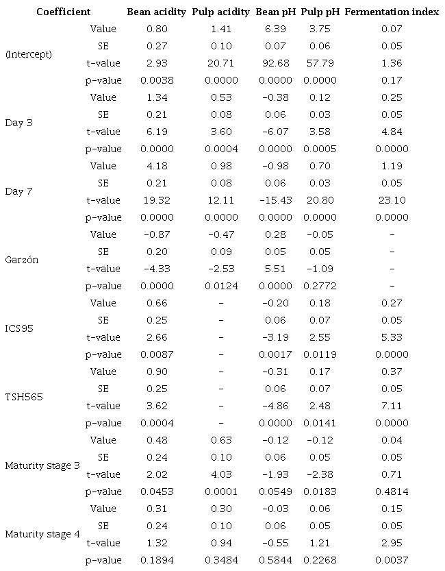 For the longitudinal analysis of bean pH, a compound symmetry structure was adjusted to the correlation matrix with a correlation of -0.02. There is a statistically significant difference (p ≤ 0.05) in the factors: day, location, genotype, and maturity stage. Bean pH on day 3 decreased by 0.38 units on average with respect to day 0, and on day 7, it decreased by 0.98 units on average concerning day 0 if the other variables remained constant. In the town of Garzón, bean pH increased by 0.28 units with respect to Algeciras if the other variables remained constant. In the ICS95 genotype, bean pH decreased by 0.20 units with respect to CCN51, and in the TSH565 genotype, it decreased by 0.31 units in relation to CCN51 if the other variables remained constant. In maturity stage 3, it decreased by 0.12 units on average compared to stage 2, and in stage 4, it decreased by 0.03 units on average compared to stage 2 if the other variables remained constant.