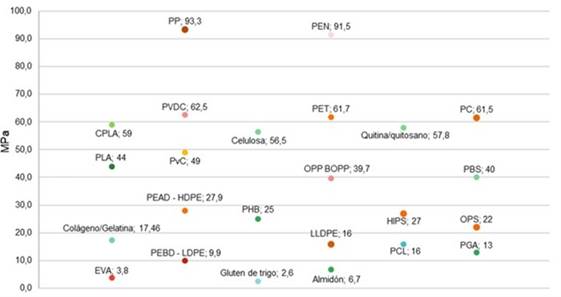 Iniciando con las propiedades mecánicas, se analiza la resistencia a la tracción, la cual depende del tipo de material, procesamiento, aditivos y almacenamiento 20. Según los resultados obtenidos, se encontró que biomateriales como el CPLA, celulosa y quitina/quitosano presentan una resistencia a la tracción superior a la de varios tipos de empaques tradicionales, lo que los convierte en una buena alternativa para empacar alimentos envasados al vacío, como carnes y quesos. Resultados similares a los encontrados por 21)Figura 1.