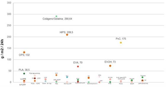 En relación con las propiedades de permeabilidad, se evaluó la tasa de transmisión de vapor de agua (WVTR), factor crucial en la selección de empaque para la mayoría de los alimentos, ya que la humedad afecta significativamente su vida útil. Según los resultados que se observan en la Figura 2, se encontró que el colágeno/gelatina al tener una alta permeabilidad al vapor de agua, resulta problemático para envasar alimentos secos y horneados 22. En contraste, los demás bioempaques como el almidón, celulosa, PLA, PCL, PGA, PBS y PHB demostraron ser una excelente alternativa para envasar cualquier alimento sensible a la humedad como algunos tipos de aceites y frutas frescas.