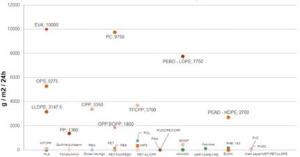 Se procedió al análisis de los coeficientes de permeabilidad al oxígeno (OTR) (Figura 3), revelando valores bajos de OTR en los bioempaques, lo que los convierte en una opción adecuada para alimentos que son propensos a la degradación rápida debido al oxígeno, como frutas y verduras frescas, alimentos horneados o productos cárnicos 23. Por otro lado, se observó que los empaques derivados del petróleo exhiben OTR elevados, lo que implica que estos termoplásticos permiten la penetración de altas concentraciones de oxígeno y por ende, se deben emplear en combinación con materiales, como tereftalato de polietileno PET o polipropileno fundido CPP o Etileno-Vinil-Alcohol EVOH, para reducir la permeabilidad al oxígeno y mejorar su capacidad de envasado 10.