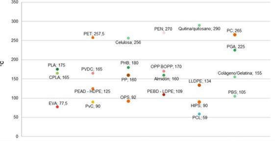 Con relación a las propiedades térmicas, biomateriales como el PGA, la celulosa y los empaques de PET, PC y PEN, presentan altas temperaturas de fusión y se recomiendan para la fabricación de botellas. La quitina/quitosano, aunque exhibe buenas características térmicas, debe combinarse con otros materiales para lograr su moldeado 24. Estos hallazgos son relevantes para las empresas de envases como botellas, envases para alimentos enlatados y envases asépticos que deben resistir altas temperaturas de fusión. Figura 4