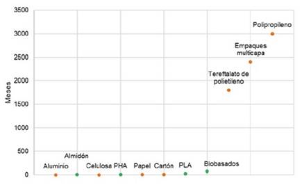 En términos de biodegradabilidad, los empaques varían en su tiempo de degradación. Materiales como el aluminio, papel y cartón se degradan en pocos meses 25, mientras que el polipropileno, los empaques multicapa y el tereftalato de polietileno tardan años o siglos en degradarse completamente 26. Por otro lado, bioempaques como PHA, almidón y celulosa, se descomponen en 120-180 días en el ambiente natural, pero el PLA y los biobasados solo se descomponen en instalaciones de compostaje industrial a altas temperaturas 27,28 (Ver Figura 5). Además, la producción y reciclaje de bioempaques pueden tener otros impactos ambientales, como el uso de gran cantidad de agua y pesticidas, y la eutrofización 29. Por lo tanto, es relevante al elegir empaques en la industria alimentaria considerar el impacto ambiental completo evaluando también las limitaciones y los desafíos asociados con su producción y reciclaje.
